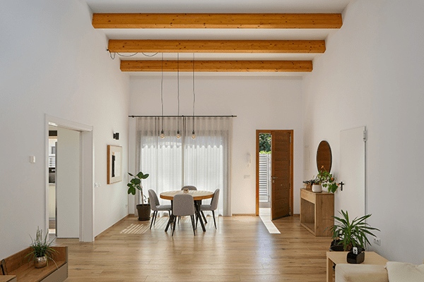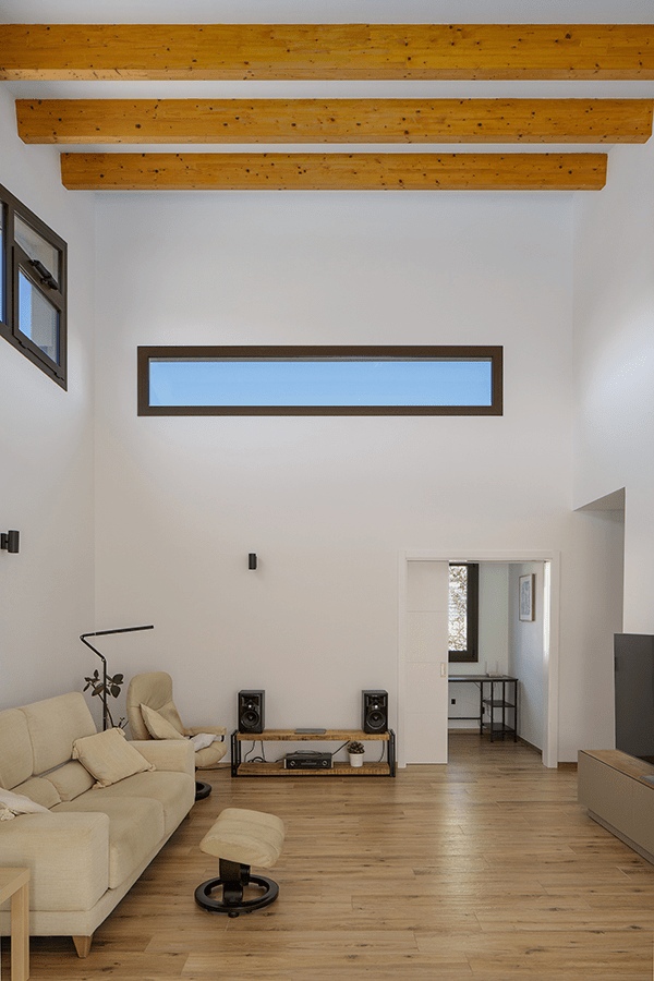 La idea s’articula en tres volums independents, cadascun amb una funció molt precisa. El volum central, més alt i amb coberta inclinada a una sola aigua, es converteix en el cor de l’habitatge. És aquí on es produeix l’accés principal i on es desenvolupa la vida de dia. L’espai s’obre sense fals sostre, deixant les bigues de fusta vistes i permetent que la llum i l’alçada donin una sensació d’amplitud i respir.
